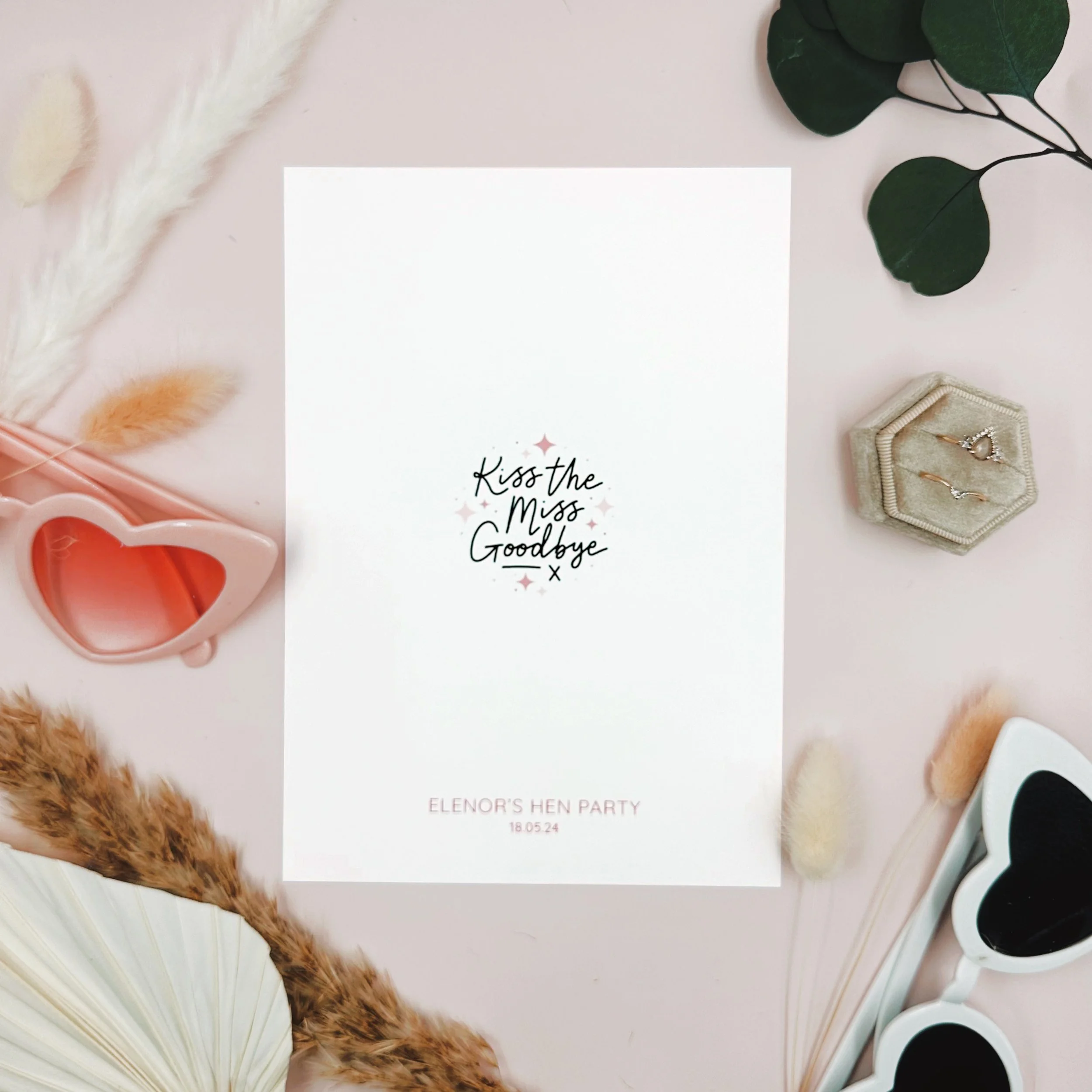 Categories: Shop All Stamps Let's Party! Sticker Sheets Enamel Pins Notepads Washi Tape Prints Die Cut Stickers Sale! Let's Party! Kiss The Miss Goodbye - Personalised Hen Party Print £5.00 He Said She Said - Hen Game from £1.50 Photo Challenge - Hen Game from £1.50 Bridal Bingo - Hen Game from £1.50 Would She Rather - Hen Game from £1.50 Guess The Dress - Hen Game from £1.50